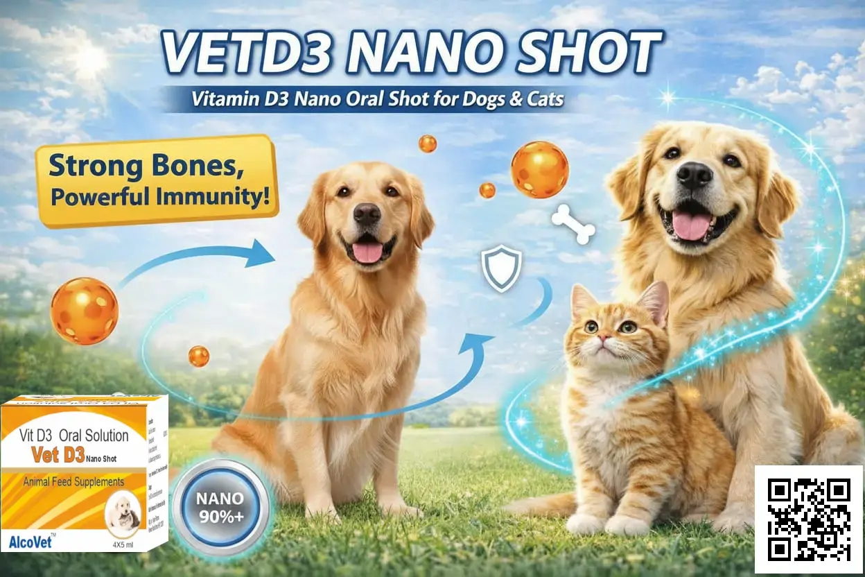 VetD3 Nano Shots is a nano-emulsified vitamin D3 supplement formulated for dogs and cats to support calcium–phosphorus homeostasis, skeletal development, and bone mineralisation when used under veterinary supervision.